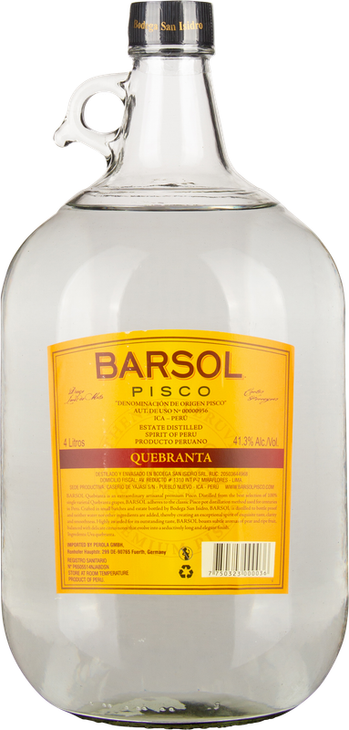 Die beliebte Quebranta-Traube wird in Peru als „nicht-aromatisch“ klassifiziert und ihre subtilen Aromen stehen für den typischen Pisco-Geschmack. Und den gibt es hier im großen Gebinde mit dem Barsol Quebranta, der ideal für einen „Pisco Sour“ ist.